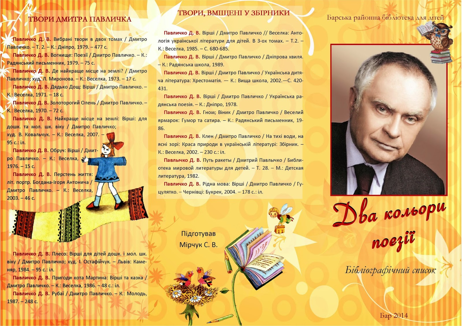 Автору поезії "Два кольори", яка пізніше стала народною піснею, Дмитру Павличку в цьому році виповнилося 85 років. До цієї події в бібліотеці створено бібліографічний список "Два кольори поезії".